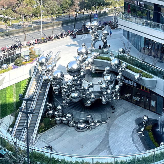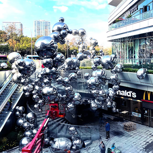 購物商場鏡面不銹鋼氣球雕塑具有諸多優點。它不僅堅固耐用,能抵御各種自然環境的侵蝕,而且具有良好的可塑性,能夠塑造出豐富多樣的造型。從現代簡約風格到古典優雅的藝術作品,不銹鋼雕塑都能完美呈現。