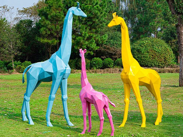 切面長頸鹿雕塑,就是指身體造型以切面拼接的方式制作的長頸鹿雕塑,這種造型的雕塑和傳統的具象雕塑相比,成本更低,在視覺上卻比具象雕塑更具沖擊力,性價比很高。玻璃鋼切面長頸鹿雕塑多數位于室外,比如廣場、花壇、林蔭道上、山坡、草地、池畔等。