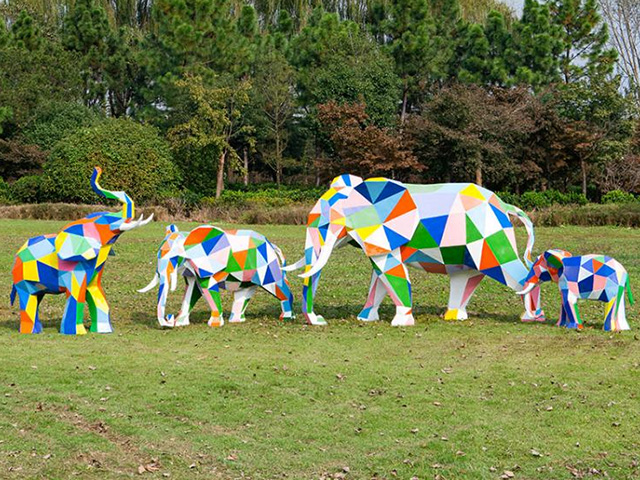大象作為吉祥如意的象征,被廣泛應用于雕刻之中,玻璃鋼幾何切面大象雕塑就是順應切面造型日益流行的趨勢而制作出來的,在保持大象本身造型不變的前提下,通過幾何切面的形式使其抽象化,從而使得其更加前衛,讓人看了眼前一亮。