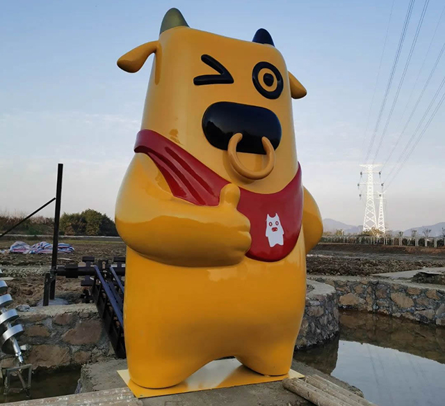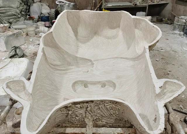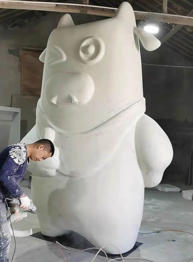 玻璃鋼雕塑制作的基本步驟:制圖-泡沫塑形-石膏開模-胚體制作-胚體打磨-底漆-氣孔修補-面漆(噴色塊-小色手繪)-罩面漆-安裝。以諸暨豐收牛雕塑為例,詳細介紹雕塑的制作流程。