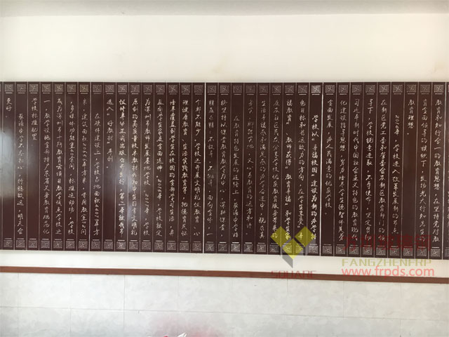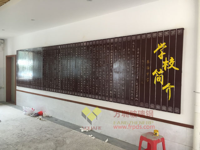 玻璃鋼字體浮雕是我公司為深圳市某中學生產的玻璃鋼制品,規格6000*1500mm,使用激光雕刻機在玻璃鋼鋼板上雕刻設計好的文字字體,然后用優質汽車專用噴漆調試噴渡,塑造出古典厚重的歷史文藝氣息,以熏陶一代又一代的莘莘學子,字體浮雕凸顯了學校厚重的底蘊文化,傳揚了學校優秀的教學理念,表達了學校悠久的辦學歷史,增加了師生的認同感,提高了師生的自豪感,更重要的是激勵了學生追尋目標,勇往直面,永不放棄的決心。