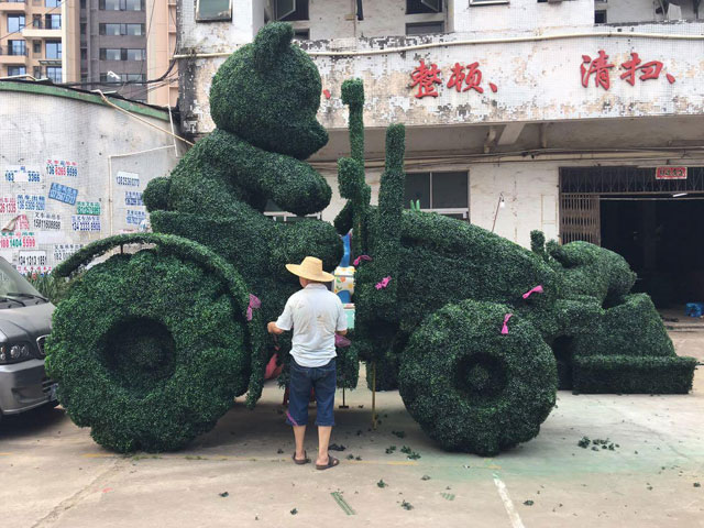 綠雕植物雕塑的制作過程也是一項復雜而精細的工程。首先,設計師需要根據場地環境和客戶需求進行創意設計,繪制出詳細的設計圖紙。然后,選擇合適的植物品種,并進行精心培育和修剪,使其達到最佳的生長狀態。接著,施工人員按照設計圖紙進行現場安裝和造型,將植物固定在特定的框架上,形成完整的雕塑作品。最后,還需要對綠雕植物雕塑進行定期的養護和管理,確保植物的健康生長和雕塑的美觀效果。