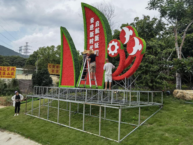 綠雕植物雕塑的制作過程也是一項復雜而精細的工程。首先,設計師需要根據場地環境和客戶需求進行創意設計,繪制出詳細的設計圖紙。然后,選擇合適的植物品種,并進行精心培育和修剪,使其達到最佳的生長狀態。接著,施工人員按照設計圖紙進行現場安裝和造型,將植物固定在特定的框架上,形成完整的雕塑作品。最后,還需要對綠雕植物雕塑進行定期的養護和管理,確保植物的健康生長和雕塑的美觀效果。