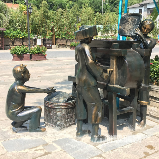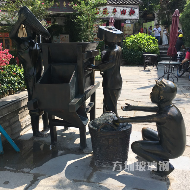? 仿銅鄉愁玻璃鋼人物雕塑制作工藝:雕刻泥稿-泥稿確認-模具制作-產品毛胚制作-表面效果處理-包裝。