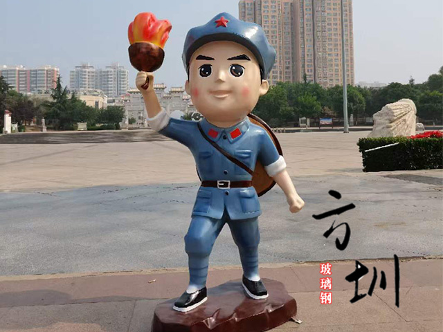 廣場玻璃鋼卡通小紅軍人物雕塑制作工藝:雕刻泥稿-泥稿確認-模具制作-產(chǎn)品毛胚制作-表面效果處理-包裝。