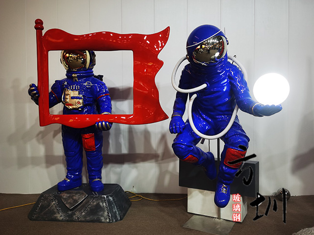 電鍍噴鍍發(fā)光玻璃鋼宇航員雕塑制作工藝:雕刻泥稿-泥稿確認(rèn)-模具制作-產(chǎn)品毛胚制作-表面效果處理-包裝。