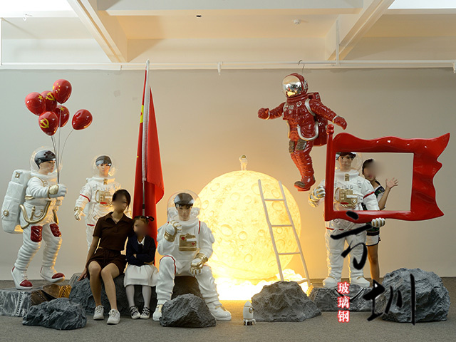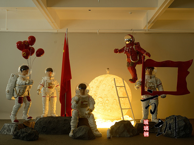 打卡拍照玻璃鋼太空人組合雕塑制作工藝:雕刻泥稿-泥稿確認-模具制作-產品毛胚制作-表面效果處理-包裝。