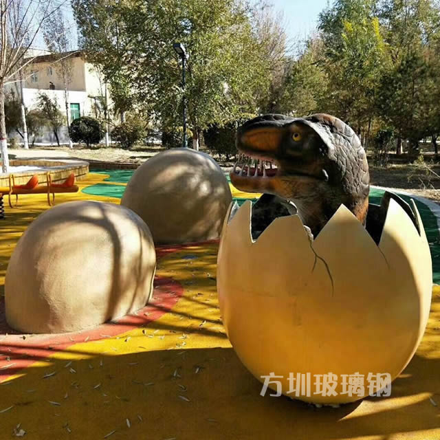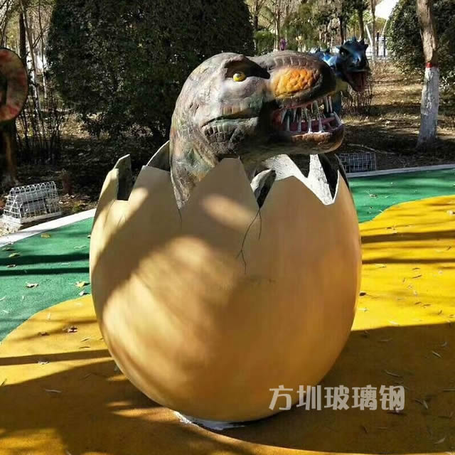 動物園恐龍蛋玻璃鋼雕塑制作工藝:雕刻泥稿-泥稿確認-模具制作-產品毛胚制作-表面效果處理-包裝。