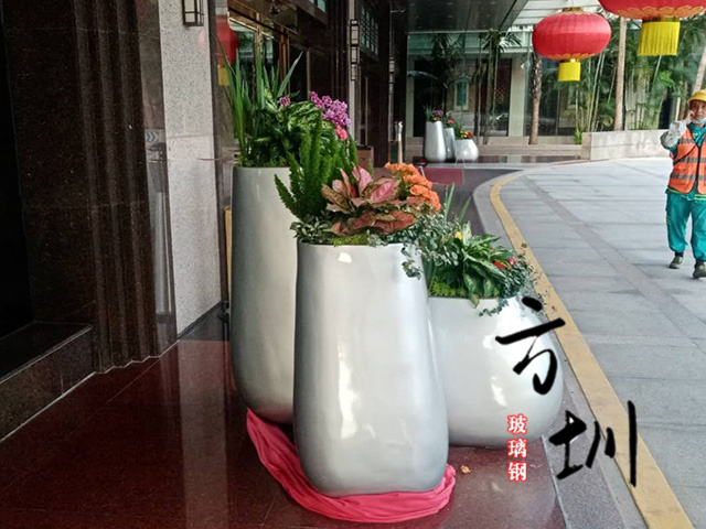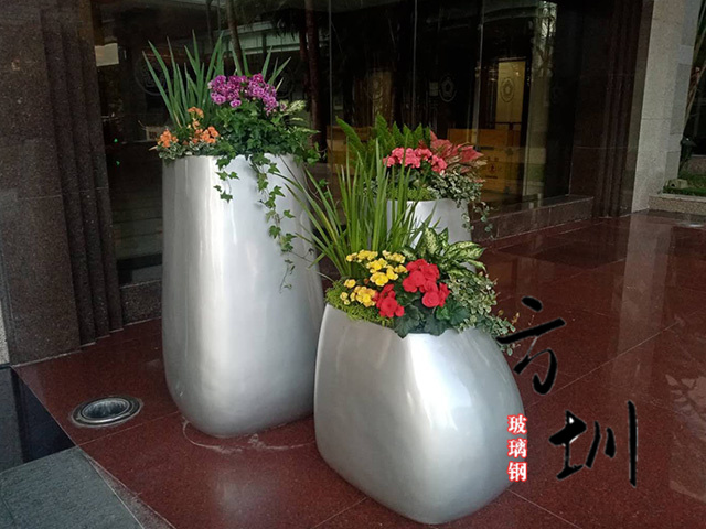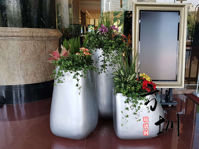 賓館玻璃鋼組合式花盆型號為HP736,三個不同尺寸標準分別為500*500*1140mm、400*400*900mm、400*480*650mm,可單獨或自由組合擺放運用,高中低層次感強,對室內外空間起到立體美化的作用。采用優質樹脂和玻璃纖維及進口膠衣等復合而成,表面做淺灰色亮光漆作用,玻璃鋼花盆集占地少、靈活性大、美化裝修、種上綠植凈化室內空氣等實用性強的一款多功能時尚景觀組合花盆。裝點裝修深圳五洲賓館環境,以鮮花綠植為視覺傳播載體的景觀擺件,特性與裝修偏重,深受空間美化裝修行業青睞。
