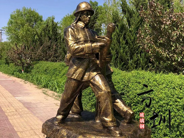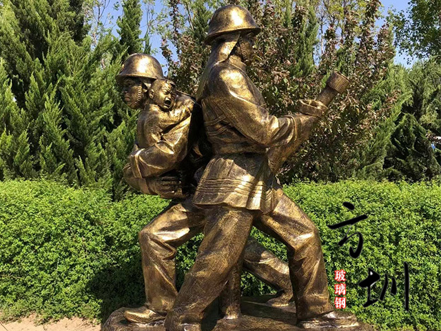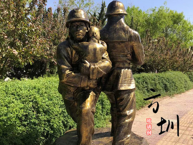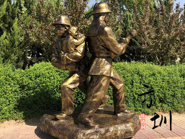 仿銅玻璃鋼消防官兵救人雕塑既是延安精神、太行精神乃至全民族抗戰精神的生動展現,又與延安精神、太行精神甚至民族抗戰精神的形成和造就密不可分。 紅物雕塑創造重要的目的就是弘揚紅色文化,所以在實際的創造中應該充分了解故事的時代背景和人物的精神品質,通過雕刻塑造人物的靈魂。在個性塑造的層面,不僅僅是要塑造人物表面的形體形象,更要注重人物的思想品質。